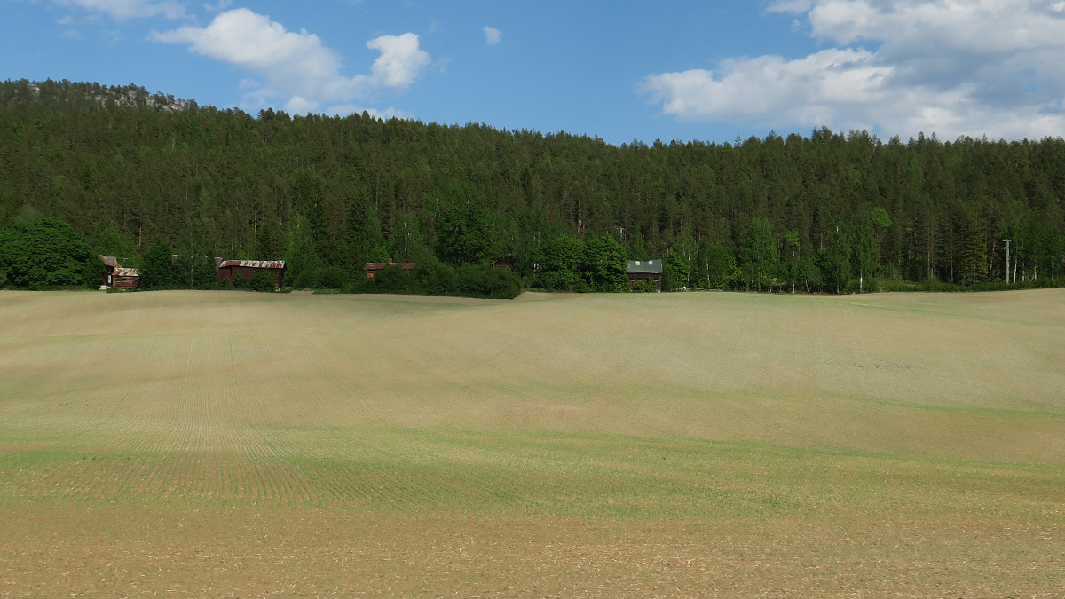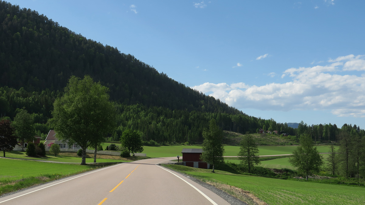 Når jeg skal videre, vurderer jeg hovedveien eller vestsideveien. Har kjørt på vestsida et par ganger før og det er stedvis veldig humpete – men jeg tar sjansen – kanskje asfaltmaskinene har vært her. Det har den ikke! Den første halvdelen av strekningen til Prestfoss er som før, men så har det tydeligvis. Men det er godt med en avveksling og vi snakker stedvis om to helt ulike landskap sammenlignet med det en opplever fra hovedveien.