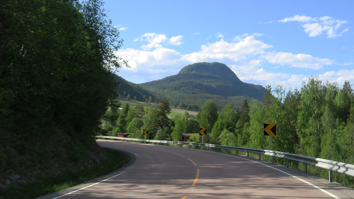Det er nok av svinger oppover her, og en må ikke pine alle. Jeg finner en fin rytme og fryder meg over NC’ens bunndrag. Den gir et herlig skyv ut av svingene. Fortsatt er det noen humper og dumper igjen etter vinterens telehiv, og det har dukket opp noen ny i forhold til i fjor. Sola står fortsatt relativt høyt, men enkelte steder kaster trærne lange skygger over veien og gjør det vanskelig å se dumpene og humpene og jeg får et par overraskelser.