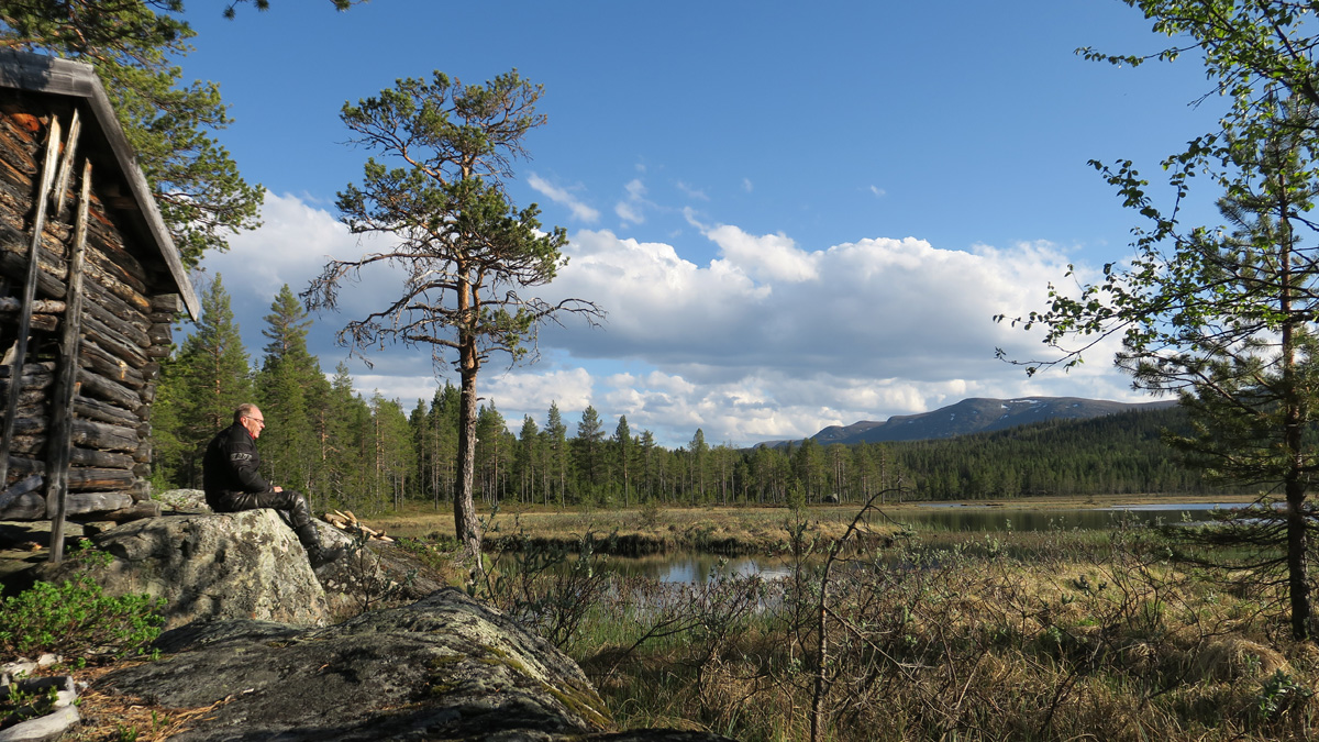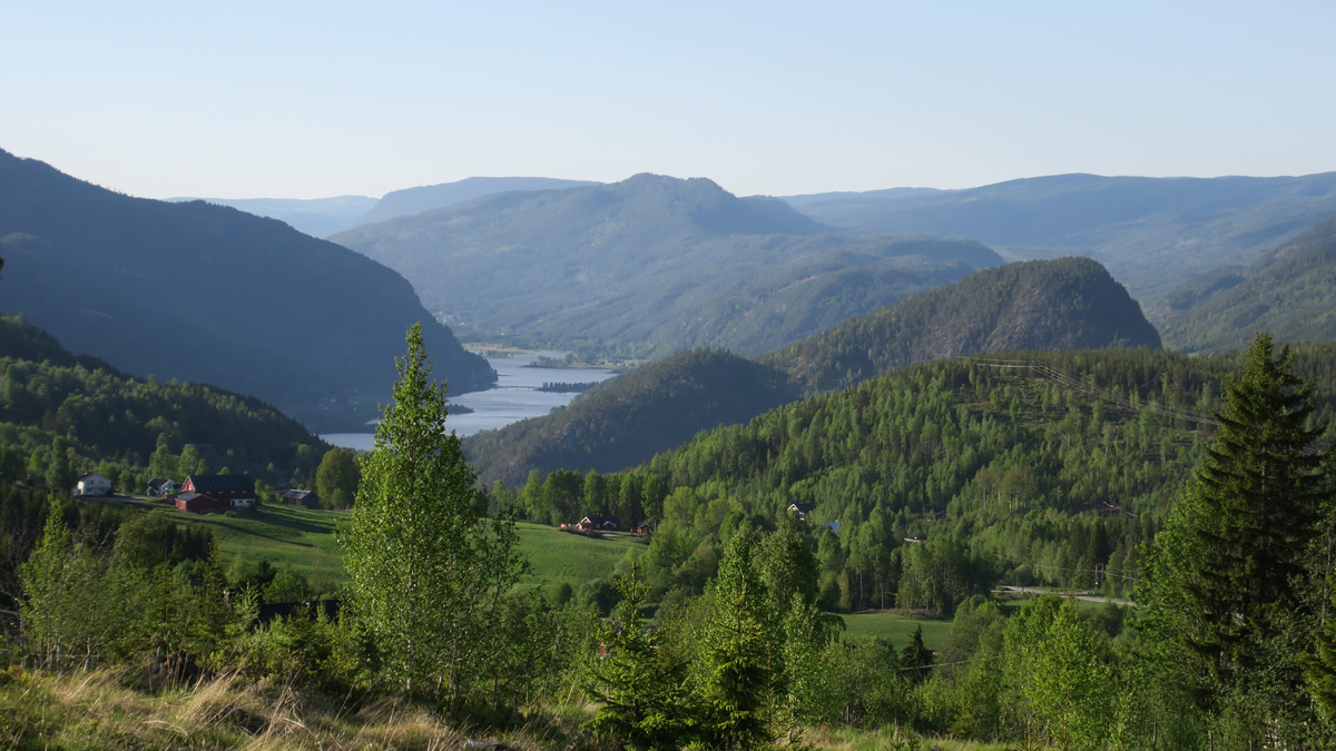 Etter en snartur oppom hytta fortsetter jeg retning Bromma. Det er litt svalere luft over fjellet, men fortsatt godt og varmt. Jeg passerer Flenten og har nå stort sett utforbakke ned til Bromma. Ved Svangtjernmyra tar jeg en liten pause i solveggen ved løa. Småfisken lager ringer i vannet og det er behagelig stille. Å oppleve en så deilig sommerkveld allerede i mai skjer ikke ofte. Men jeg må videre. Litt lengre nede åpner utsikten til Hallingdalselva. Skogen har tettet et par utsiktspunkt, men det er fortsatt mulig å nyte utsikten ned til elva.