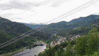 Jeg holder meg på hovedveien i retning Rødberg. Ved Rågrend begynner veien å bikke utfor og jeg skal gjennom 9 hårnålsvinger før jeg etter hvert er nede ved Nore I kraftverket. Jeg har gjort unna nesten 300 høydemeter siden den første hårnålsvingen. Nesten nede stopper jeg og ser på utsikten ned til Rødberg og Rødbergdammen og får dessuten sett nærmere på de kraftige rørene som tidligere forsynte Nore I med vann fra Tunhovdfjorden på nært hold. I dag går vannet i tunnel i fjellet og de to rørgatene er fredet.